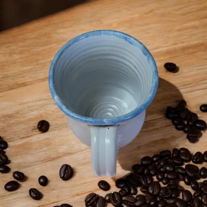 Each mug is lovingly hand-thrown and hand-painted, showcasing a lead-free White glaze with wispy grass details and a sponged light blue glaze on top. With a capacity of approximately 14 fluid ounces, it’s perfect for your favorite hot beverages. Please note that due to the handcrafted nature of this item, slight variations in color, shape, and size may occur, making each mug uniquely special.